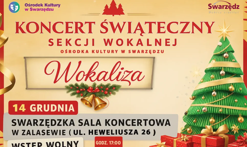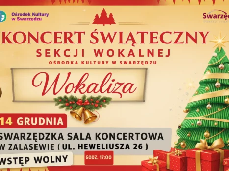 Ośrodek Kultury zaprasza na Koncert Świąteczny Sekcji Wokalnej „WOKALIZA” Magia muzyki, świąteczne światła i wyjątkowa atmosfera czekają na Ciebie. Wystąpią: Scenografia przygotowana przez Sekcję Plastyczną Ośrodka Kultury Wstęp wolny