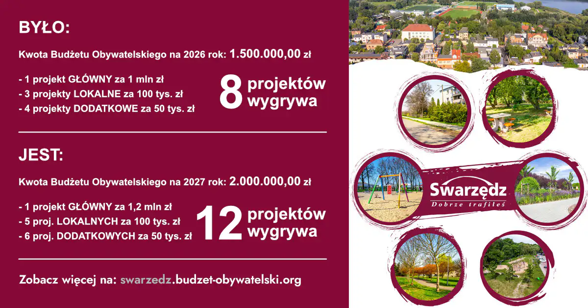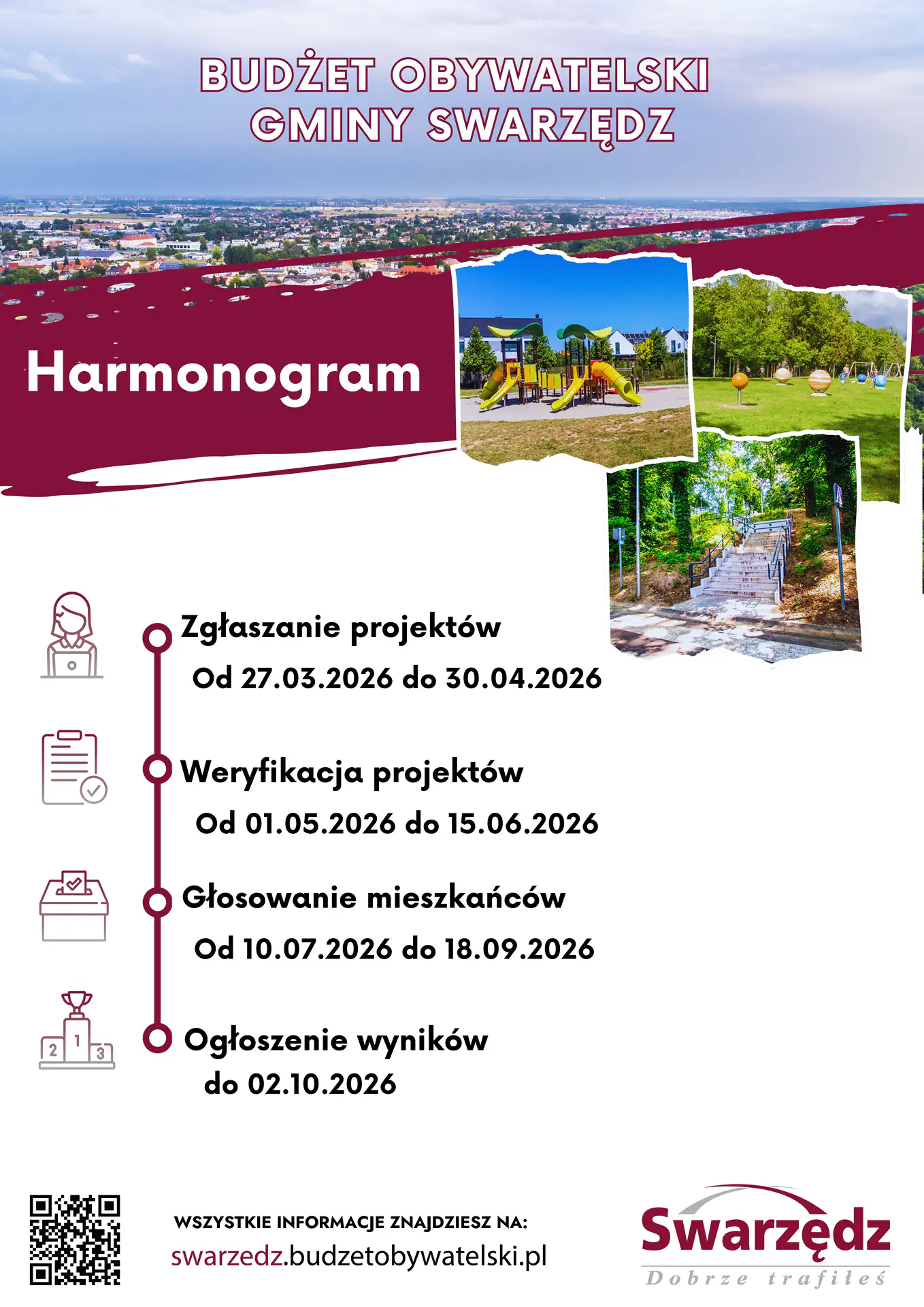 - od 27.03.2026 r. do 30.04.2026 r. – zgłaszanie propozycji projektów do Budżetu Obywatelskiego Gminy Swarzędz
