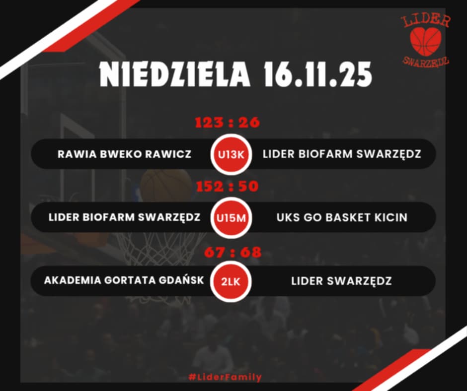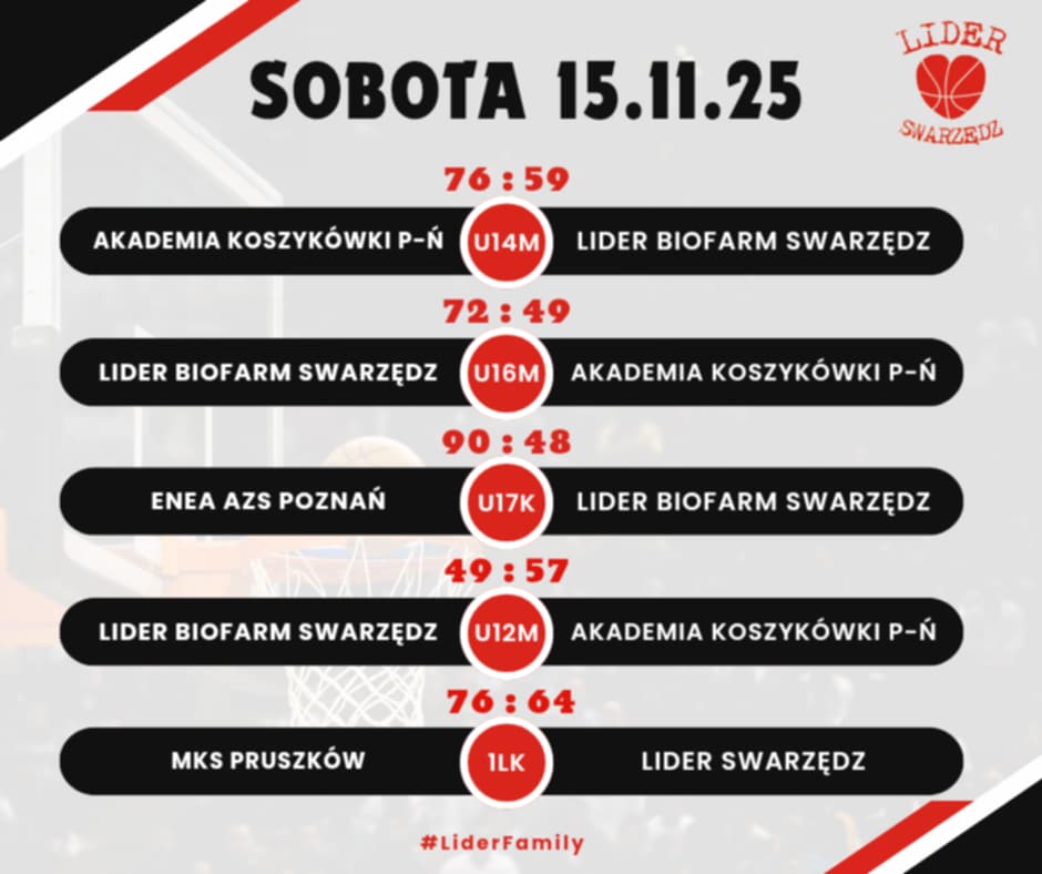 To był kolejny intensywny koszykarski weekend – 7 meczów swarzędzkiej młodzieży. W sobotę odbył się trójmecz chłopaków z Akademią Koszykówki Poznań. W Poznaniu w kategorii U14M Liderowcy ulegli 59:76 – Kurzawski 4, Kaba 2, Kozielczyk 6, Książkiewicz 1, Iwaniec 6, Danielewicz, Maciejewski 8, Laskowski, Wochna, Ksenicz, Jarek 16, Staszkiewicz 16. W kategorii U16M górą podopieczni trenera Rafała Łażewskiego, którzy zwyciężyli 72:49 – Czarnecki E., Badziński 13, Kurka, Kaczyński 10, Weselik 16, Błachnio 9, Karbowy, Stenclik 5, Czarnecki T. 19. W kategorii U12M lepsi byli rywale, ale po zaciętej walce 49:57 – Żurkiewicz, Zatoń, Skalski 2, Zagożdżon 2, Jurek 23, Śniegocki 17, Walich, Woźniak 2, Jeske, Marcinowski 1, Włodarski, Łęski, Apolinarski 2, Piskuła. Jedyny mecz dziewcząt to pojedynek Juniorek U17K z potentatem ligowym ENEA AZS Poznań. Słaba pierwsza połowa zadecydowała o porażce 48:90 – Bieżyńska 3, Tobiszowska 2, Stańko 1, Chmielewska 1, Cimińska, Woźniak, Nowak 21, Rogowy 12, Sakowska, Mioduszewska 2, Kamińska, Michalak. W niedzielę trzy mecze – wysoka porażka Młodziczek Starszych U13K w Rawiczu 26:123 – Stróżyńska, Golik 5, Bela 1, Walich, Kolarz, Supranowicz, Wiśniewska 4, Makowska 4, Kryśkiewicz, Cimińska, Stachowiak, Pluta 4, Rakoniewska, Rybak-Tądrowska 8. Kadeci U15M zdeklasowali UKS Go Basket Kicin 152:50 – rzucając już do przerwy 99. Liderowcy grali w składzie: Badziński 37, Kozielczyk, Kurka 28, Domański 2, Danielewicz 12, Domański 2, Stenclik 16, Staszkiewicz 32, Jaworski 3, Czarnecki T. 20. Ostatnim meczem był mecz młodych Liderek w 2LK w Gdańsku z Akademią Gortata. Sporą niespodziankę sprawiły młode koszykarki Lider Biofarm Swarzędz, które na wyjeździe pokonały 68:67 rywalki. Podopieczne trenera Tomasza Eicherta prowadziły długimi w fragmentami, ale w czwartej kwarcie to rywalki wyszły na kilkupunktowe prowadzenie. Konsekwentna gra w ataku i obronie doprowadziły to szalenie emocjonującej końcówki. W niej Alicja Rogowy na 10 sekund przed końcem trafiła trójkę dająca Liderkom jednopunktowe prowadzenie, które udało się utrzymać do końcowego gwizdka. Swarzędzaki zagrały w składzie: Tobiszowska, Stańko 7 (1*3), Chmielewska 1, Cimińska, Kosińska 13, Nowak 6 (2*3), Stachowiak 14 (1*3), Olejnik 21, Rogowy 6 (2*3), Kamińska.