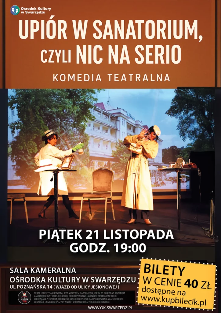 Podobno każdy potrzebuje terapii, tylko nie każdy o tym wie. Spektakl komediowo-kabaretowy pt. „Upiór w sanatorium, czyli Nic na serio” jest pretekstem do spotkania z Widzem w imprezowym sanatorium. Lawirując zręcznie między światem realu a fikcją fabularną, aktorki zacierają granice teatru pudełkowego, zaskakując widza przenikaniem się teatralnych przestrzeni. Twórczynie spektaklu wychodzą naprzeciw zapotrzebowaniu szeroko pojętej widowni na chwilę oddechu i radości. Koncentrują swe działania artystyczne wokół dobroczynnych walorów terapii poprzez śmiech, który jest wszak jednym z najlepszych antidotum na wszelki smutek i stres.