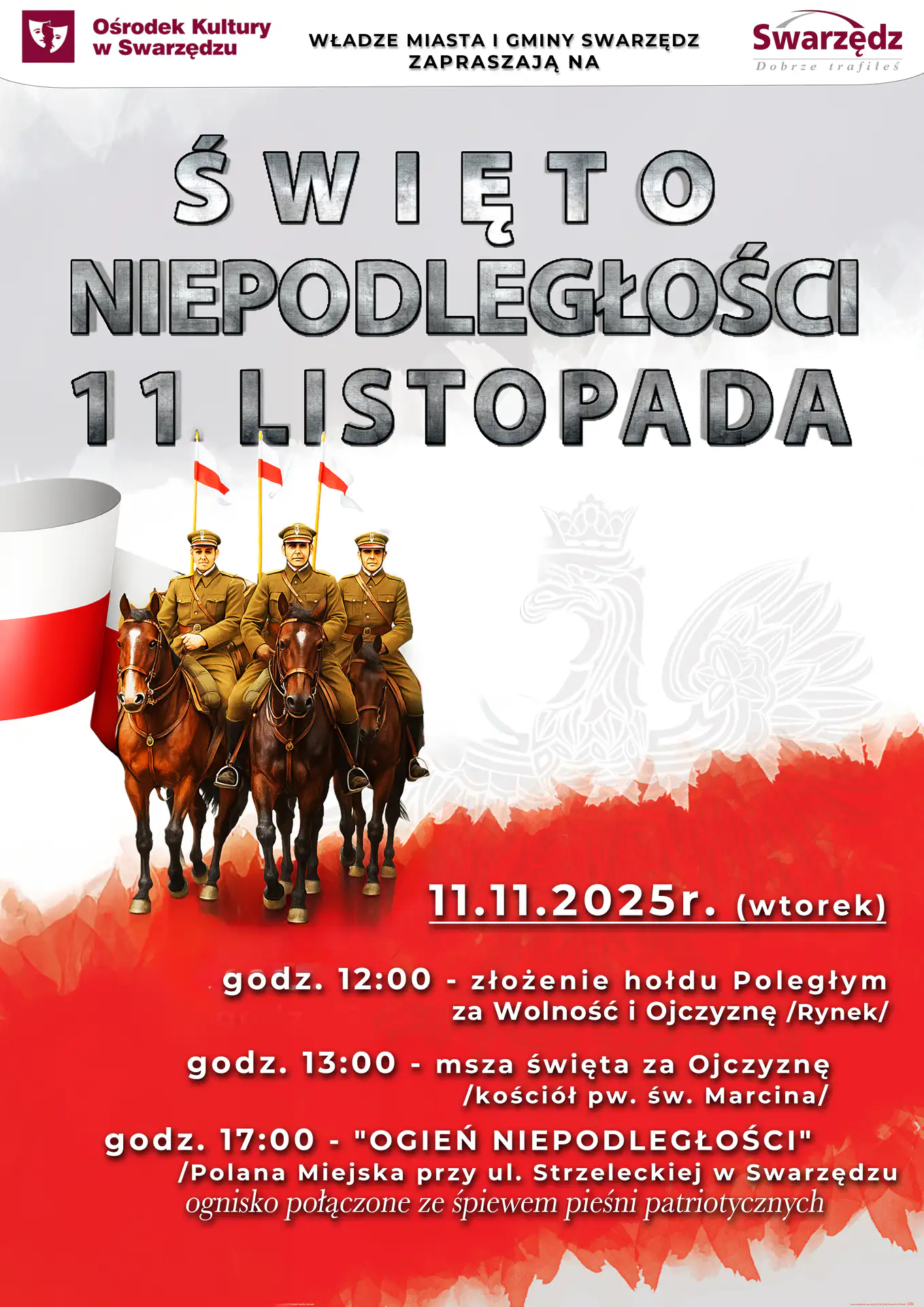 - 12:00 – złożenie kwiatów przy pomniku „Poległym za Wolność i Ojczyznę” na swarzędzkim Rynku,